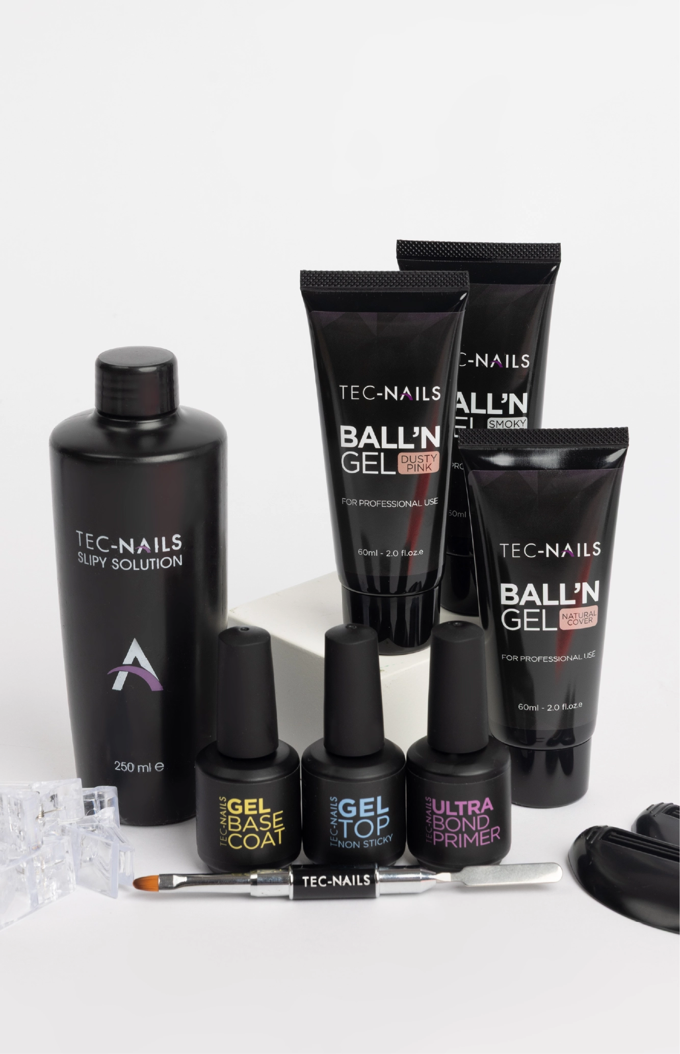 A Set of 9 products. Ball’n Gel 30ml (2+1 Free) OR Ball’n Gel 60ml (2+1 Free), Tube Squeezers, Primer 15ml, Plastic Forms 120pcs, Gel Base Coat 15ml, Two Sided Brush, Gel Top Coat 15ml Clips 5 Sets. Start by selecting your products